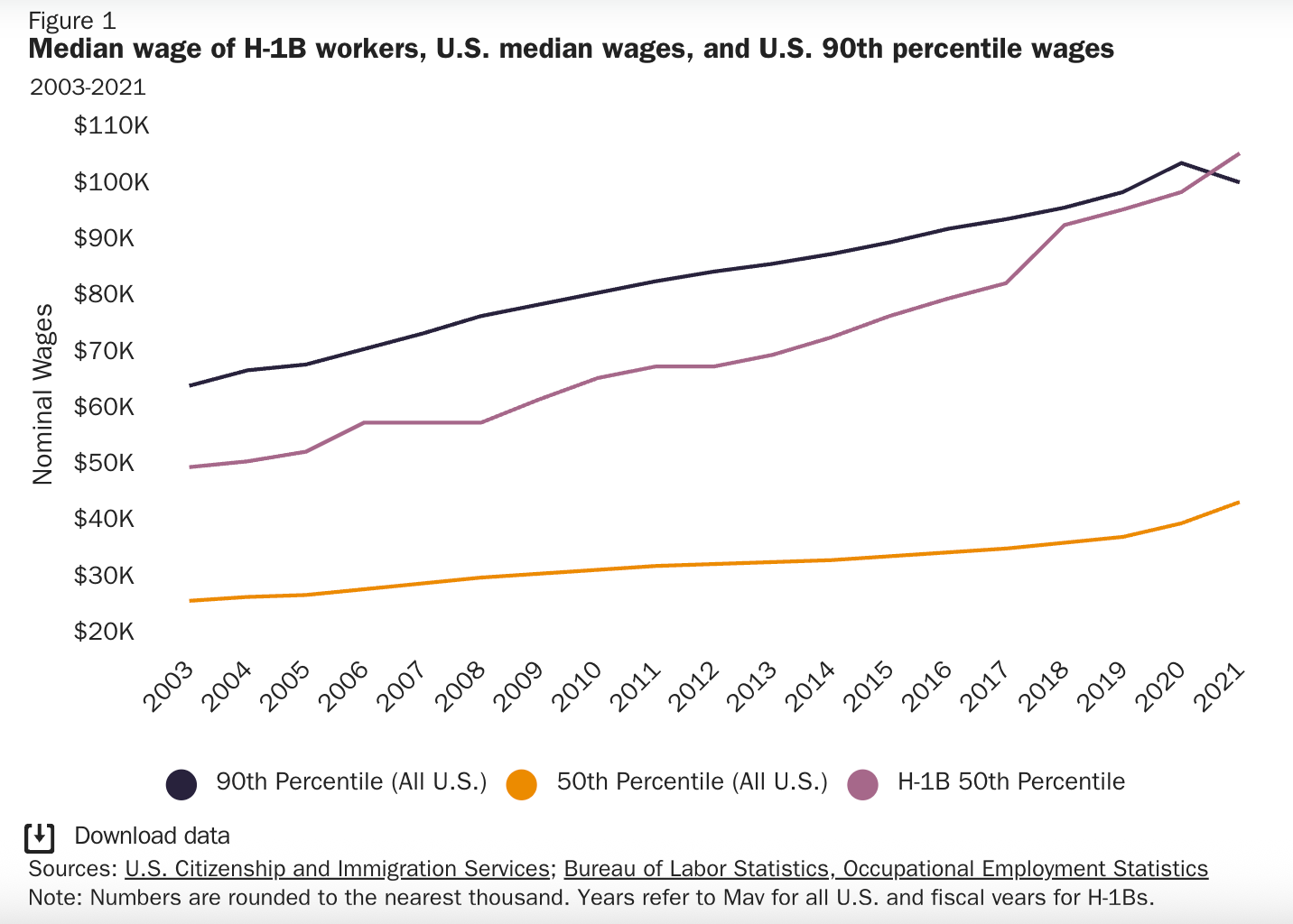 There is this Cato Institute story from 2022, titled “H‑1B Wages Surge to the Top 10% of All Wages in the US”.